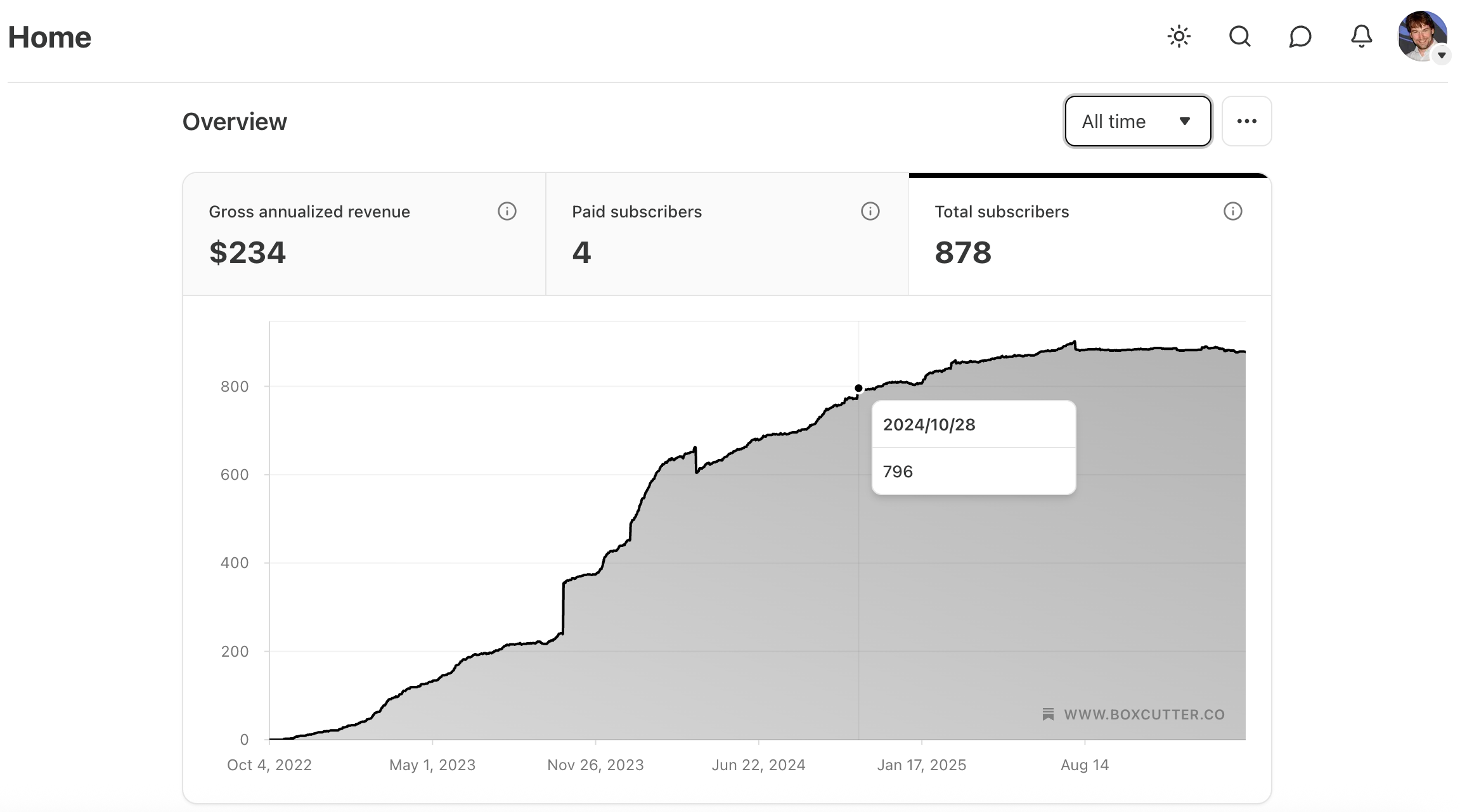 For example, this past year on Substack, my “growth” has been minuscule, with about 25 net-new subscribers. Things rocketed in the first and second year, then fully plateaued for the last 14 months or so (even gone down a little)👇