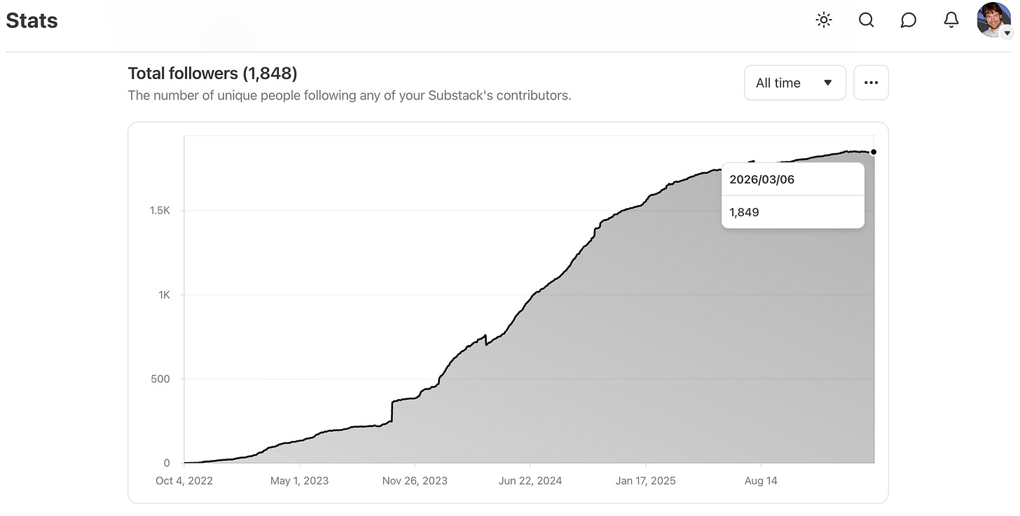 And when it comes to total “Followers” on Substack, the number is over double but has plateaued this past year. I post semi-regular ‘Notes,’ but they regularly get next to no views or engagement.