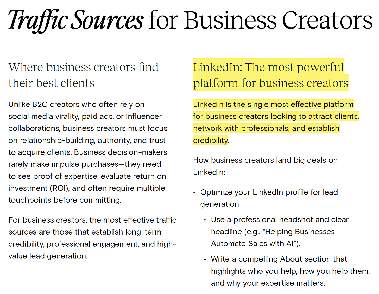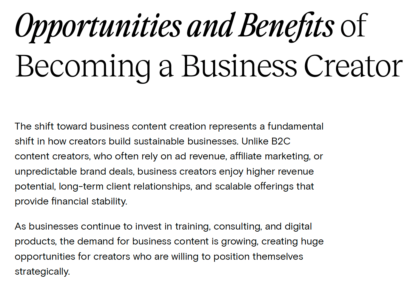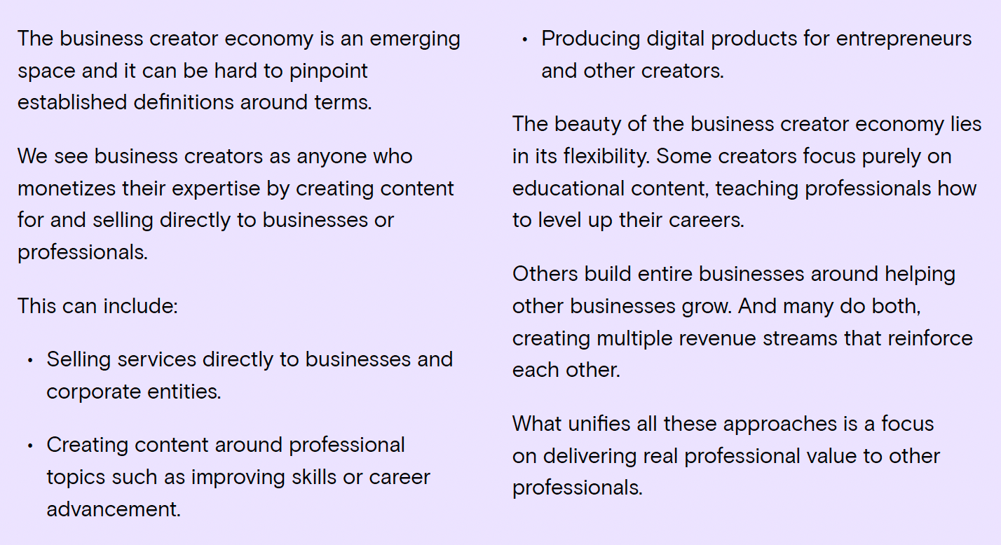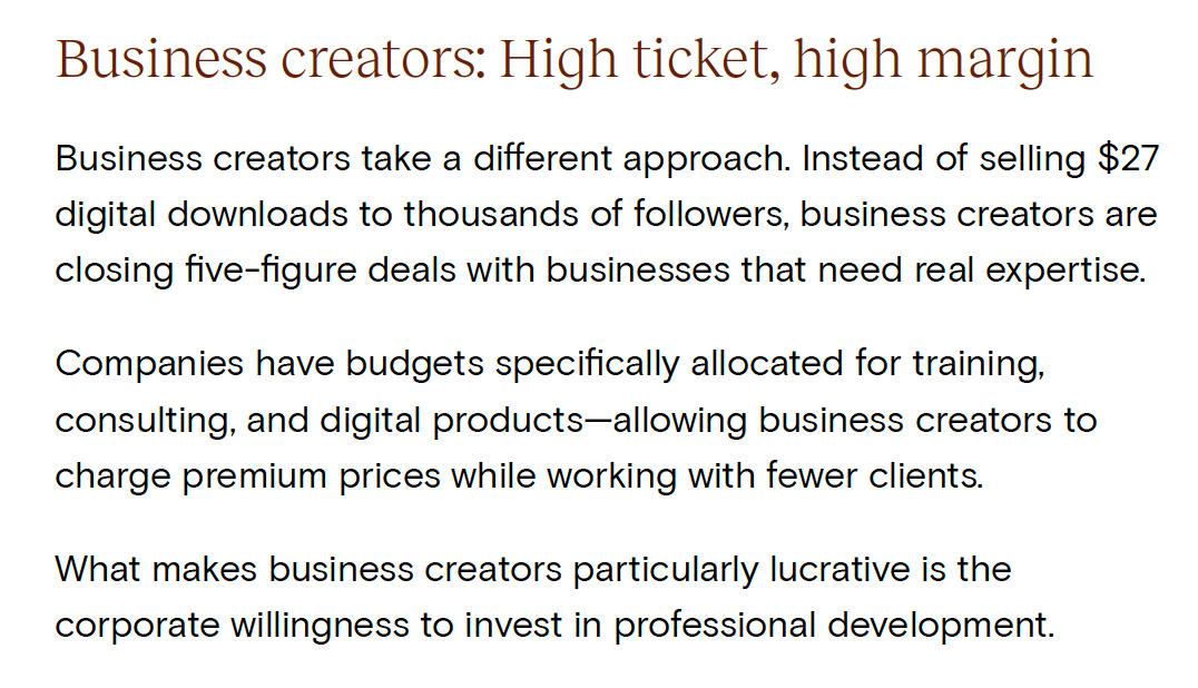 Yet within that space, the Business Creator Economy—where expertise is leveraged to help businesses, organizations, and professionals (not just individual consumers)—is where some real leverage and opportunities exist.