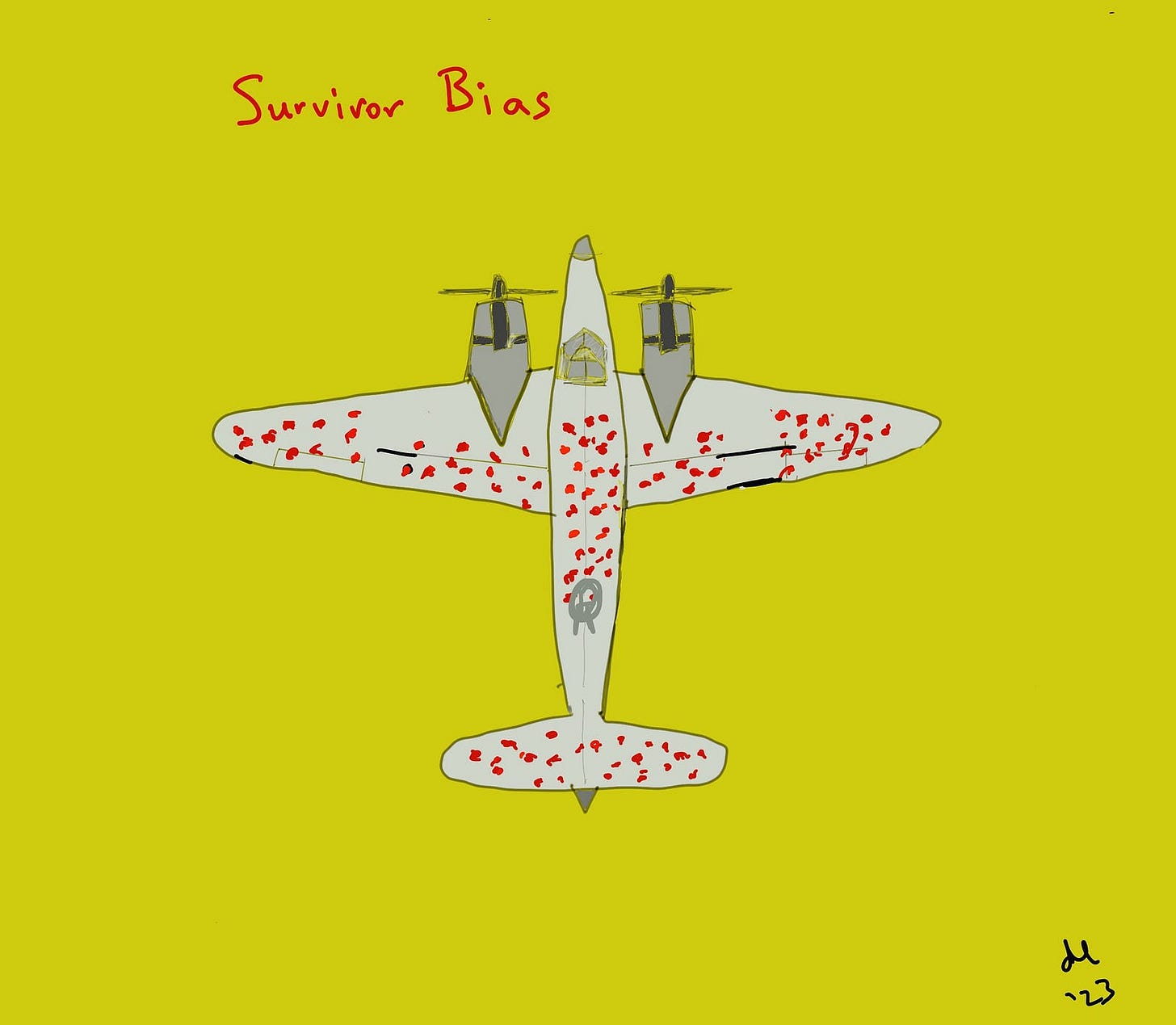 This illustration represents a classic example of survivorship bias. During World War II, engineers studied where returning bombers were hit to determine where to add armour.