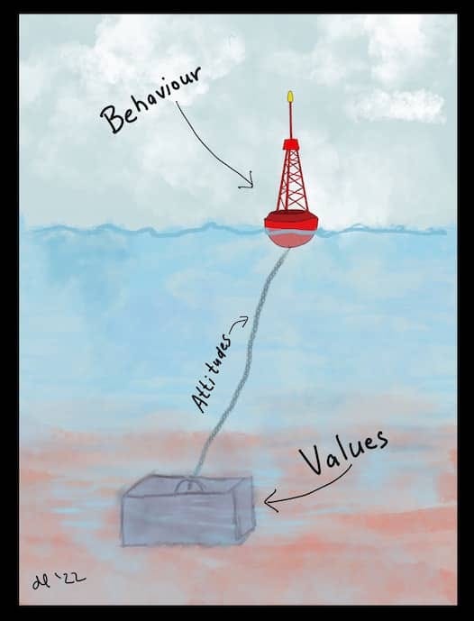 In between these two are our Attitudes. Not as stable and solid as our values. Not as variable and shifting as our behaviours.